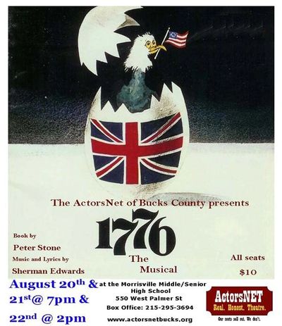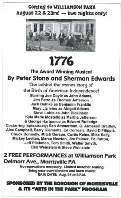 The Actors' NET of Bucks County and the Bucks County Historical Theatre Company, in cooperation with the Borough of Morrisvill, proudly present the award winning musical 1776. These special performances will be outdoors in Morrisville's Williamson Park on Delmorr Avenue. Join us as we kick-off Morrisville's bicentennial celebrations.