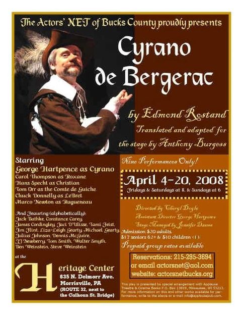 The Actors’ NET revival is no small challenge — there is a cast of 21 covering the 43 roles in the drama. Leading the procession is the husband and wife team of George Hartpence and Carol Thompson and it is they who brilliantly plow through the extraordinary dialogue. And they do it with such panache that one is tempted to believe it is everyday talk, when in fact it is the height of poetic fancy. They have considerable help, of course, from Chuck Donnelly as Le Bret; from Constance Carey as Roxane’s Duenna; from Tom Orr as the rapacious Comte De Guiche; from Walter Smyth in multiple roles, but especially as a Capuchin monk.