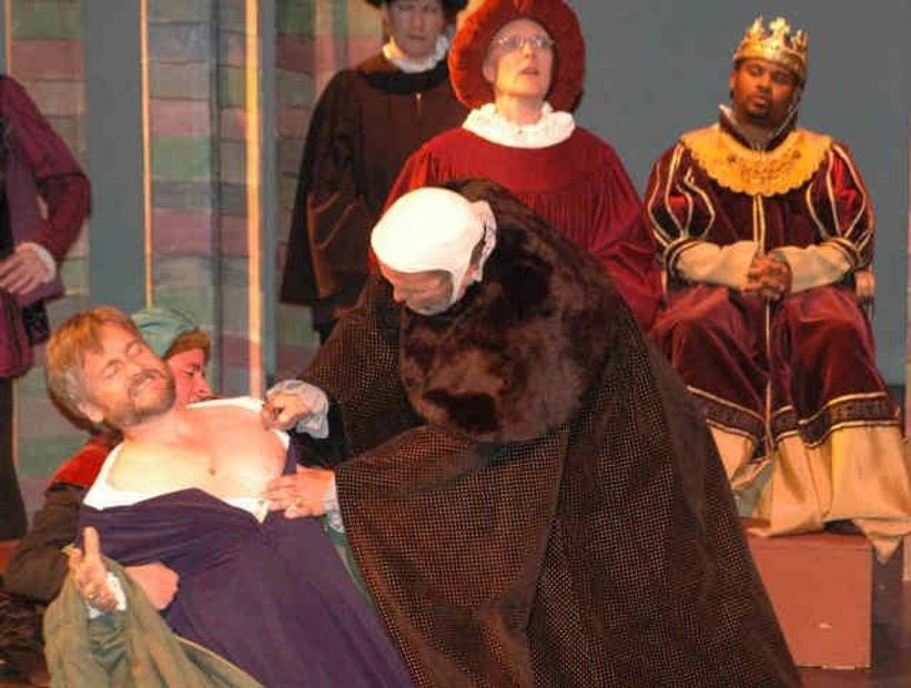 "And this production is the troupe at its very best — a blend of veteran actors much accomplished and used to working together to maximum effect. Among those veterans are the husband and wife team of Carol Kehoe and Stephen Kazakoff. Director Erath uses them to perfection in the top roles. Kehoe mixes a sensational comedy skill with her special brand of female diffidence and in her opening scene sets the mood of the evening as she taunts her pompous suitors when they try to pass "the test of the caskets," choosing between gold, silver and lead for her hand in marriage.