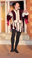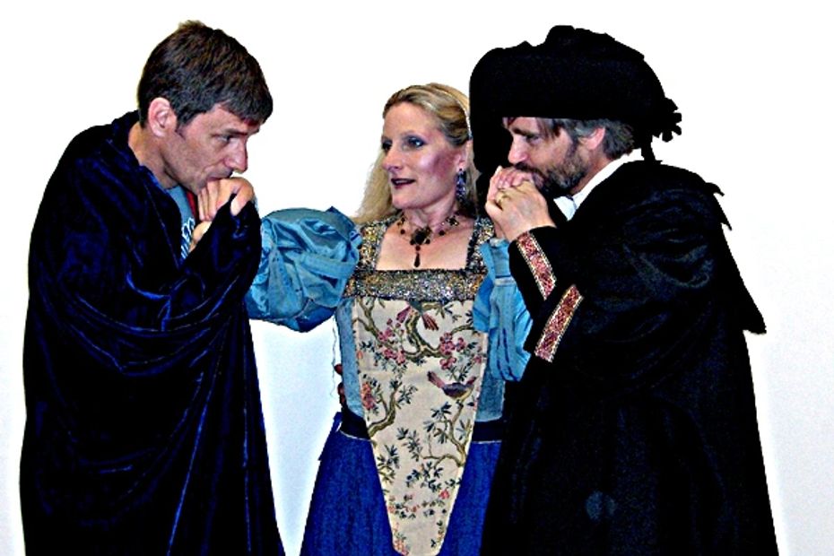 Steve Kazakoff (right) as Shylock, Dale Simon & George Hartpence (center) as Salerio & Solanio. David Harris (Leonardo - left) looks on
